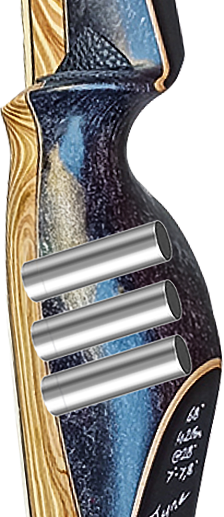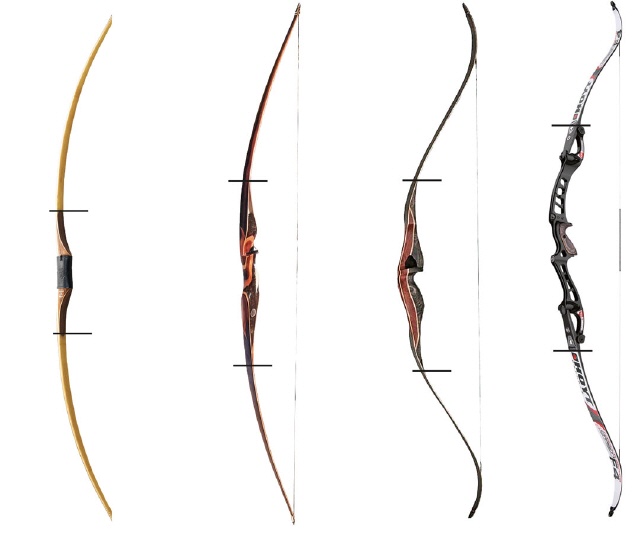 3. Verhältnis Mittelteil zu Wurfarmlänge Ein Bogen mit langem Mittelteil und kürzeren Wurfarmen ist leichter zu schießen und verzeiht mehr Fehler. Umgekehrt können lange Wurfarme mit kurzem Mittelteil zu mehr Schwingungen und damit zu geringerer Präzision führen. |