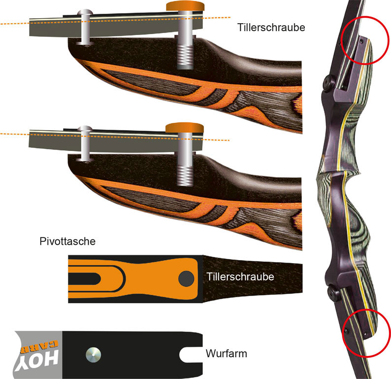 Aufgrund der Tatsache, dass der untere Wurfarm länger ist als der obere, erfordert er eine größere Vorspannung, um sicherzustellen, dass beide Wurfarme synchron arbeiten. Der Tiller bezieht sich auf den Abstand zwischen dem Ende des Mittelteils und der Sehne. In der Regel ist dieser Abstand unten kürzer als oben. Daher ist es wichtig, darauf zu achten, dass der untere Abstand etwas kleiner ist als der obere. Bei ILF-Systemen besteht die Möglichkeit, dies über die Tillerschraube einzustellen. Dadurch ist man deutlich flexibler als bei eigenen Wurfarmaufnahmesystemen.