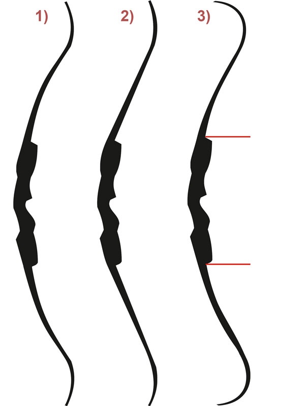 Die Effizienz des Bogens steigt, wenn die Wurfarme gerader zum Recurve verlaufen (Bogen 2). Außerdem lässt sich ein Bogen umso leichter spannen, je ausgeprägter der Recurve ist. Bei einem extremen Recurve kann man sogar das Gefühl haben, dass ein Let-Off-Effekt eintritt, ähnlich wie beim Compoundbogen.