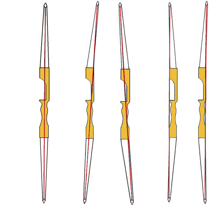Bilder links - Mitte anzeichnen: Man zeichnet am oberen und unteren Wurfarm die Mitte an. Experten verwenden dazu eine Schablone (unteres Bild).