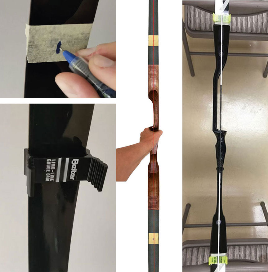 Auch hier wird die Wurfarmmitte eingezeichnet. Experten verwenden dazu Schablonen, die man auf die Wurfarme klemmt. Allerdings braucht man hier eine Vorrichtung, um den Bogen einzuspannen. Der Bogen muss vertikal aufgestellt werden, um die Ausrichtung der Wurfarme zu überprüfen. Zur Not könnte man auch den Bogen auf die Lehnen von zwei Stühlen legen und von oben drauf schauen.