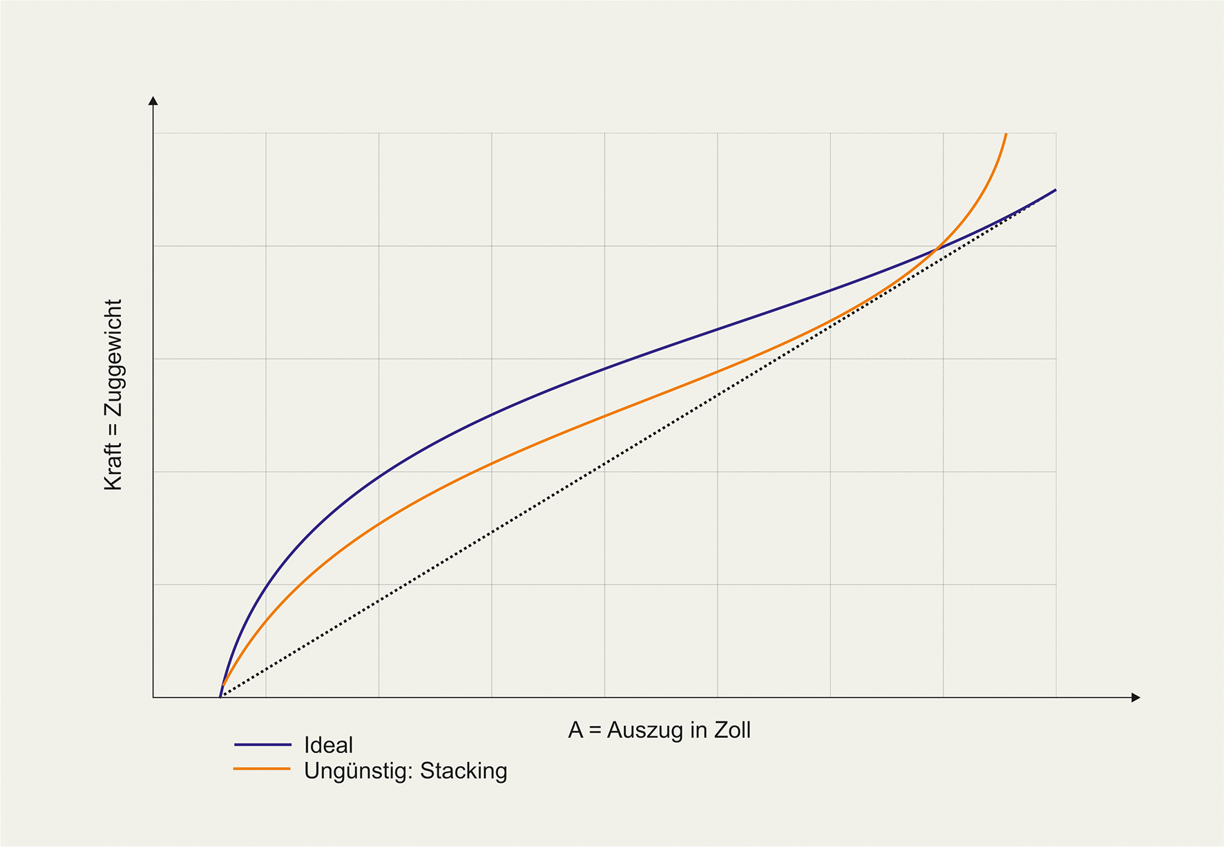 Verlässt die Auszugskurve die Referenzlinie wieder nach oben, wird der Auszug schwerer. Hier spricht man dann von Stacking. Um das zu verhindern, muss der Auszug zum Bogen passen. Wird ein Bogen zu weit gezogen, beginnt ebenfalls dieser Effekt, dass nämlich der Bogen fast nicht mehr zu ziehen ist.