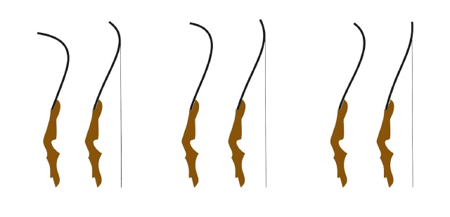 Im Bild auf der rechten Seite oben sind einige Varianten dargestellt. Dabei ist die Variante C eher ein Hybridbogen. Der Bogen B entspricht einem herkömmlichen Recurve. Und das Beispiel A hat einen extremen Recurve. Bei solchen Bögen hat man beim Ziehen das Gefühl, dass es ähnlich wie bei einem Compound eine Zuggewichtsreduzierung gibt. Ist objektiv gesehen nicht so, fühlt sich aber so an. Auch ist hier Vorsicht geboten. Die Sehne kann sehr leicht vom Bogen rutschen. Deshalb darf man hier beim Ziehen den Bogen nicht verkanten.