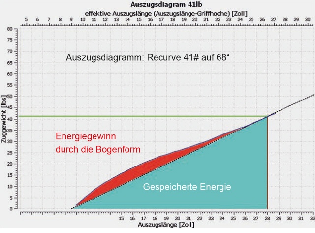 Ein Recurvebogen speichert ca. 20%, ein Compoundbogen ca 35% mehr Energie als ein gleich starker Langbogen. Wie in Zugkraftkurven leicht erkennbar, ist ein Langbogen schlechter als ein Recurvebogen. Ein Compoundbogen speichert nochmal mehr lineare Energie als ein Recurve.