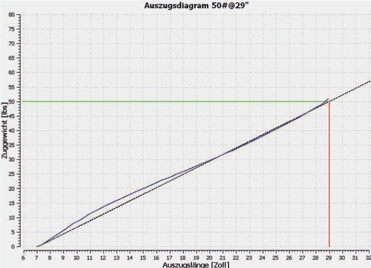 Ein kurzer Bogen, der bis an die Grenzen seiner Belastbarkeit gezogen wird, stackt und lädt sich mit überproportional viel Kraft pro Zoll auf. Daher fühlt er sich unangenehm im Vollauszug an. Hier spricht man von einer Stack-Linie, also dem Ende der gleichmäßigen Federbiegung, die Kurve bricht nach oben aus.