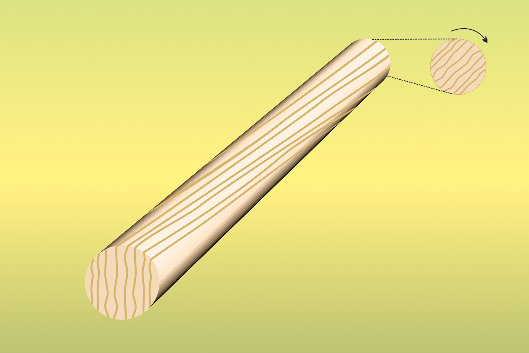 Für das bloße Auge sind die Jahresringe meist gut sichtbar, die mitentscheidenden Zellstrukturen innerhalb der hellen Zuwachszone jedoch nicht. Die Jahresringe gehen oft nicht gleichmäßig durch den Schaft, sind in sich verdreht oder laufen, bedingt durch schlechten Zuschnitt, diagonal aus dem Schaft heraus (Bild 4). Jahresringe verlaufen zudem innerhalb des Baumstamms im Kreis, haben also eine leichte Krümmung im Querschnitt des Schaftes.