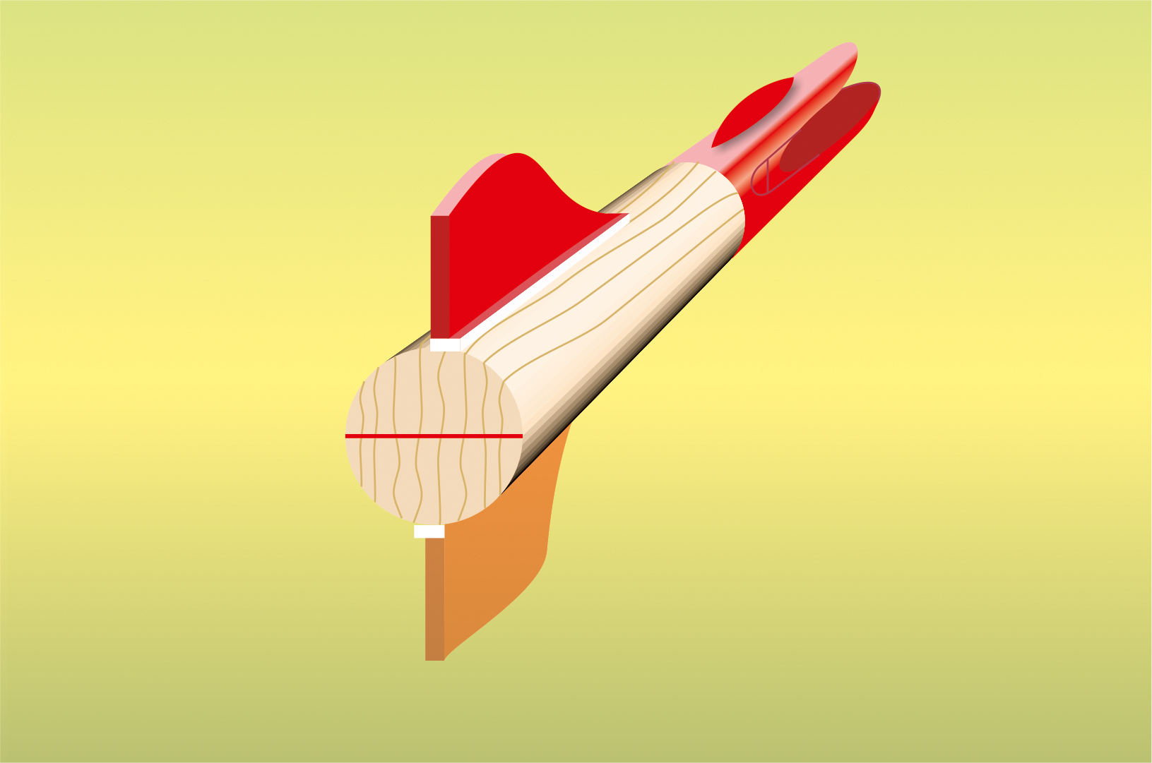 Wegen der Jahresringe im Holz bekommt man unterschiedliche Werte bei der Spinewert-Messung, je nachdem ob man senkrecht oder quer zu den Jahresringen misst. Anders als bei Alu oder Carbon ist es hier nicht egal, wie ich den Schaft auf den Spinetester lege. Eine Messung auf die senkrechten Jahresringe hat eine geringere Durchbiegung zur Folge als eine Messung auf die waagrechten Jahresringe (Bild 3). In manchen Fällen stimmt das aber nicht. Ein gewisser Prozentsatz von durchgeführten Messreihen ergab umgekehrte Ergebnisse. Dies ist eben auch ein Teil der Individualität des Naturprodukts Holz. Kleine Messunterschiede ergeben sich auch, wenn man den Schaft um 180 Grad dreht.