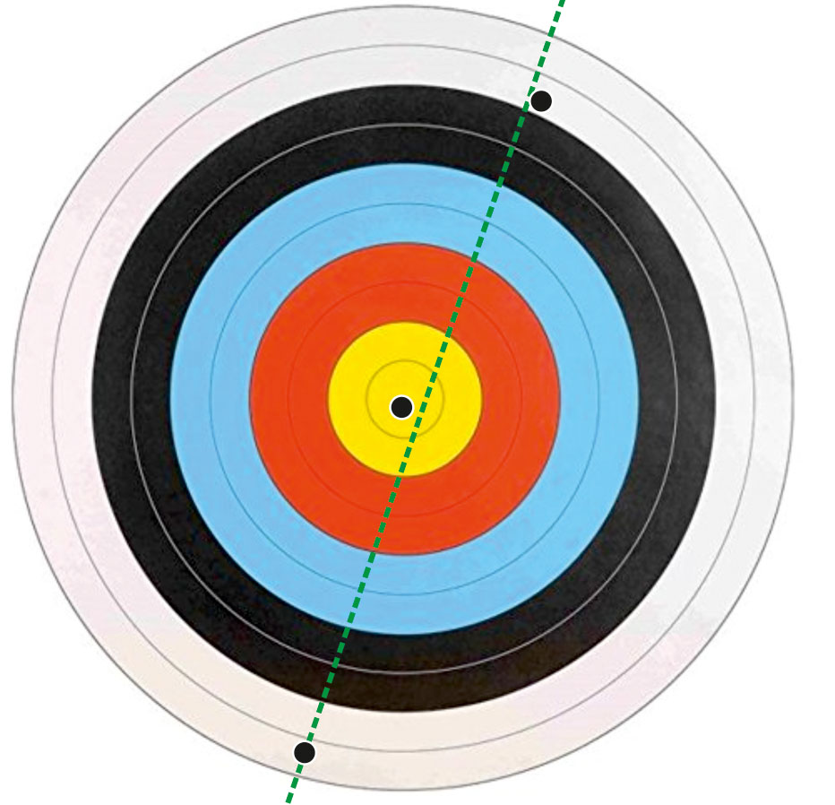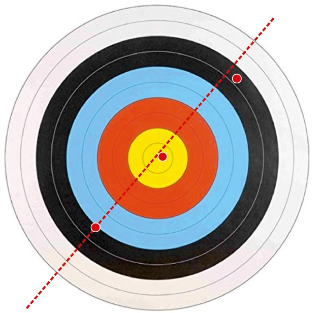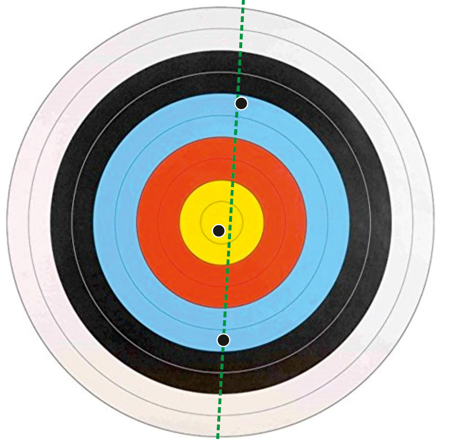 Schießt man beispielsweise im Regen und die Federn werden nass, hat man fast einen Blankschaft. Dadurch wird das Trefferbild dann stark verändert. Die Pfeile zeigen unter Umständen ein ähnliches Trefferbild wie in Bild 2. Unterschiedliche Auszüge wirken sich seitlich sehr stark aus.