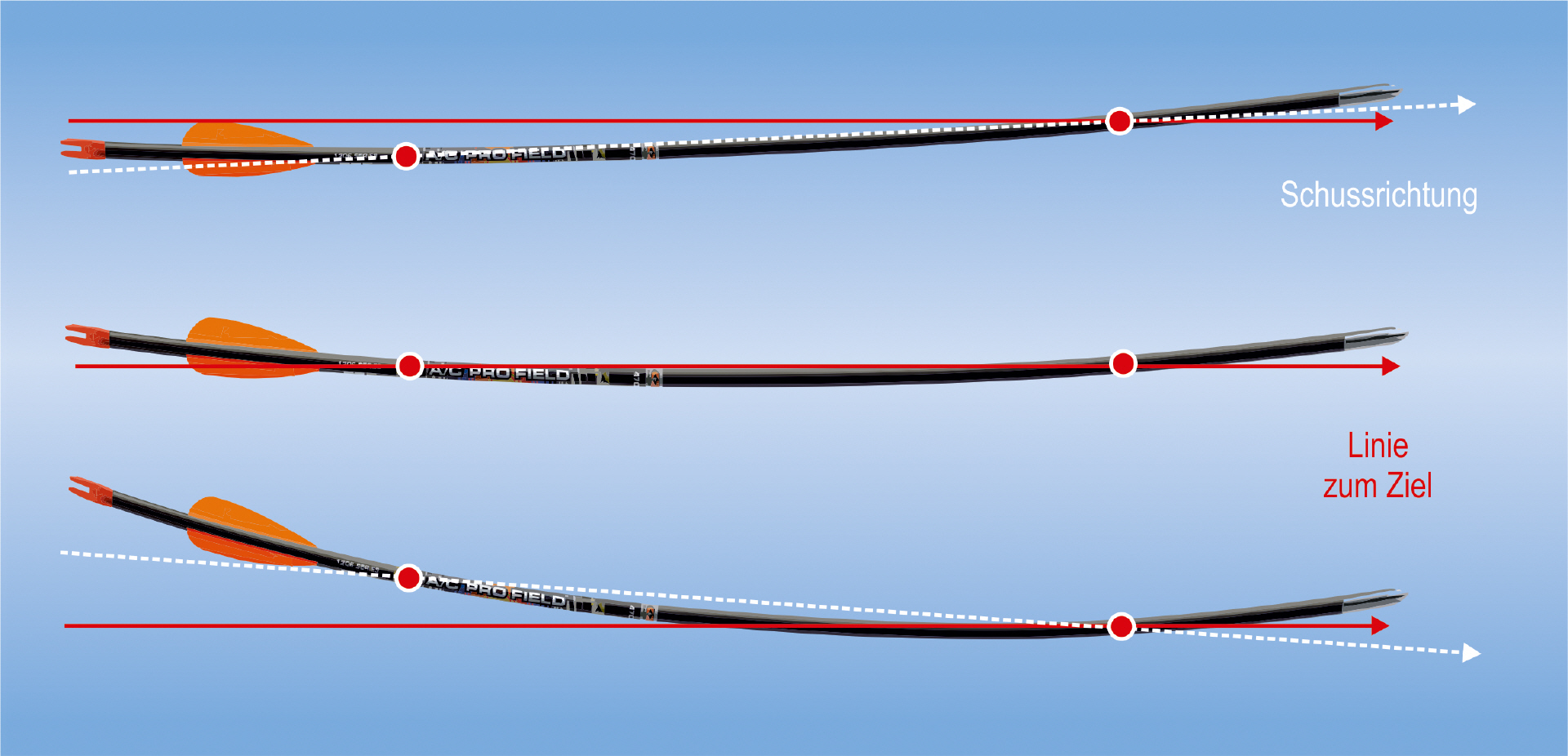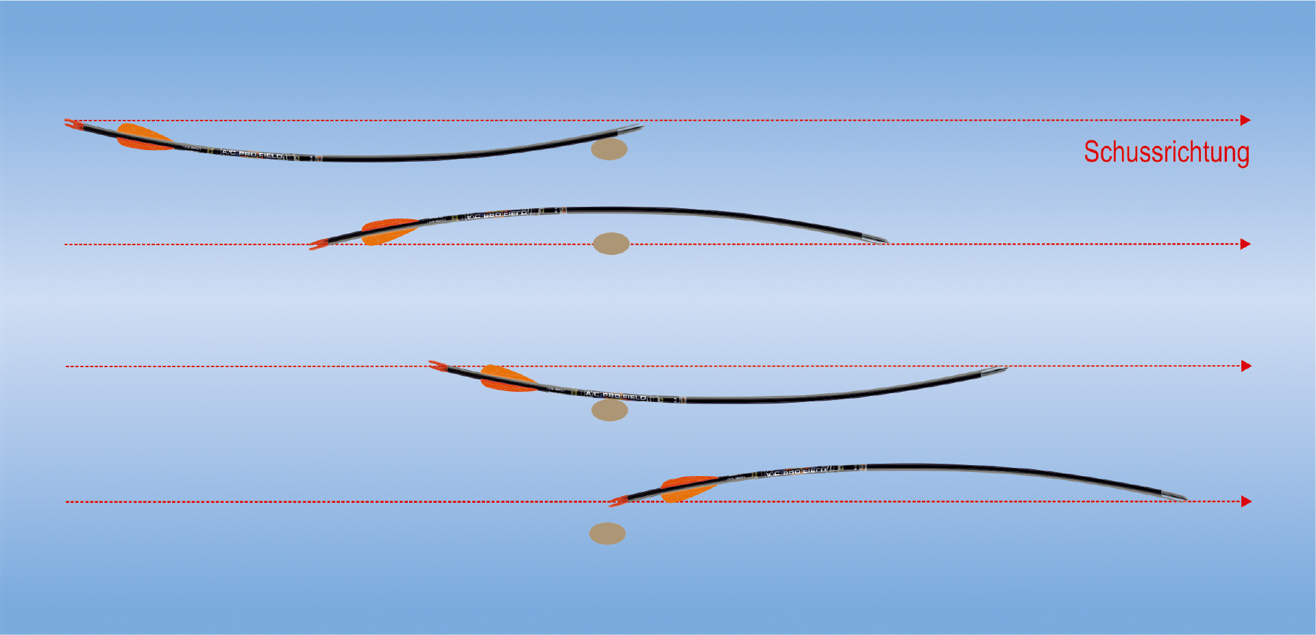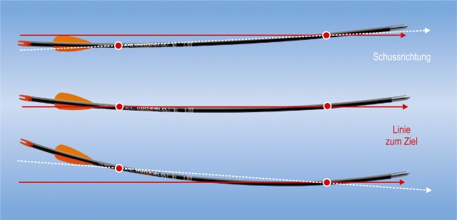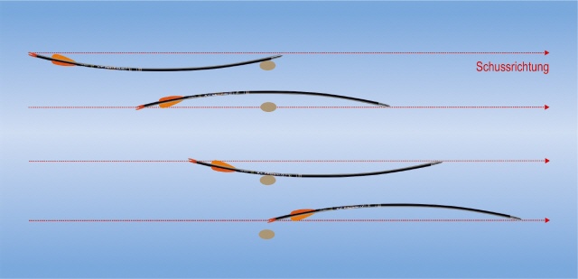 - Der Pfeil biegt sich beim Abschuss mit der Mitte zum Bogen hin, bis er etwa 1⁄3 der Strecke aus dem Bogen heraus zurückgelegt hat.