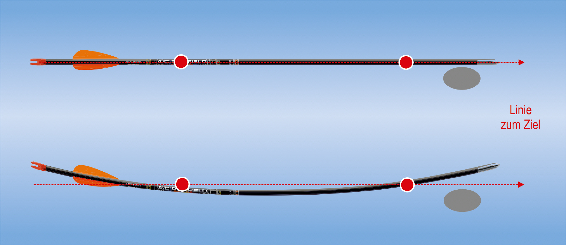 Kurzum: Je weiter der Pfeil von der horizontalen Mitte des Bogens weg liegt, umso wichtiger wird der Spine. Das ist wegen des weiteren Wegs des Pfeils beim Abschuss um den Bogen herum und der zunächst schräg vom Ziel wegweisenden Pfeilrichtung. Nur der richtige Spine garantiert den geraden Weg. Der instinktiv Schütze kann sein Gerät bei Abweichungen von der geraden Fluglinie entsprechend ausrichten. Allerdings funktioniert das nur bei Pfeilen mit identischem Spine und auf die gleiche Entfernung. Der Pfeil biegt sich beim Abschuss um den Bogen herum. In diesem Zusammenhang kennen wir das sogenannte Archers Paradox. Es war ein für lange Zeit unerklärliches Phänomen, dass der Pfeil links vom Bogen weg zeigt (beim Rechtshänder, Linkshänder umgekehrt) und trotzdem geradeaus fliegt, den richtigen Spine vorausgesetzt. Deshalb wurde es auch Paradox genannt – etwas das es eigentlich gar nicht gibt.