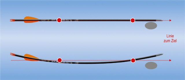 Wir lassen hier das Thema Spline außen vor. Der Spine definiert die Durchbiegung des Pfeils unter bestimmter Last auf eine bestimmte Länge der Auflagepunkte. Da dies nicht rundherum gleich ist – selbst bei Carbonmaterial nicht – sind eine Messung und eine entsprechende Ausrichtung unter Berücksichtigung des stärksten Widerstands im Spine (der Spline) ebenfalls wichtig. Das soll aber hier nicht Gegenstand der Betrachtung sein.