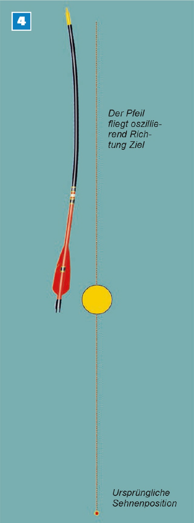 Diese Position hätte ein starrer Pfeil kurz bevor er den Bogen verlässt. Der Grund dafür ist, dass die Sehne Richtung Bogenmitte nach vorne geht und die Pfeilspitze sich dadurch nach links bewegt. Diese Diskrepanz zwischen der erwarteten Flugbahn eines steifen Pfeils und der tatsächlichen Pfeilbewegung aufgrund der Pfeiloszillation ist der Kern des Archer´s Paradox.