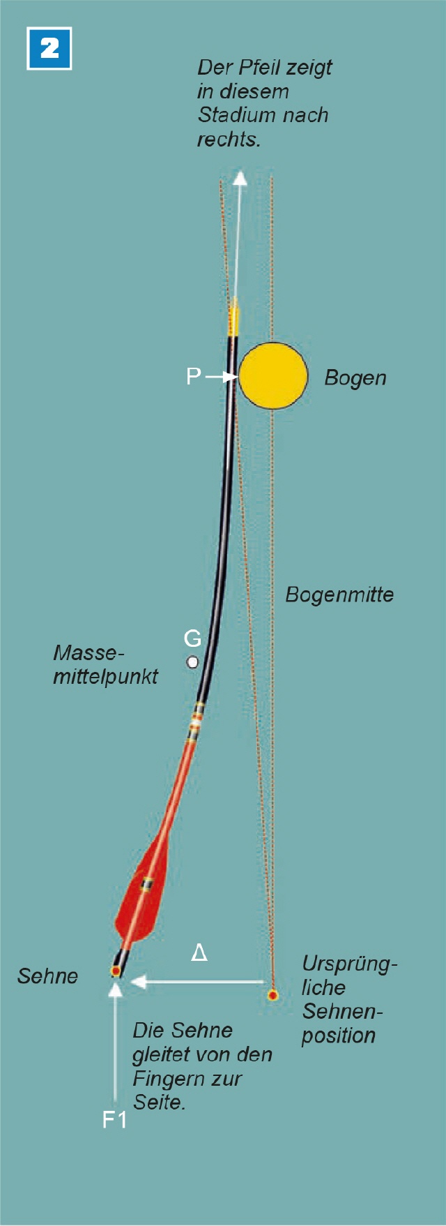 1. Wenn der Schütze seine Finger öffnet, gleitet die Sehne zuerst nach links. Das geschieht deshalb, weil man nicht in der Lage ist, die Finger sehr schnell zu öffnen. Mit einem mechanischen Release ist das im Gegensatz dazu möglich. Deshalb schwingt auch ein Pfeil von einem Compoundbogen mit Release geschossen, vertikal und nicht horizontal. 2. Die Bewegung der Sehne nach links bewirkt, dass der Pfeil horizontal zu schwingen beginnt. Die Kraft F1, die von hinten auf den Pfeil wirkt, trägt darüber hinaus zur Auslenkung des Pfeils nach links (Delta Δ) bei. 3. Der Pfeil berührt den Bogen am Punkt P. Durch die Bewegung der Sehnen nach links bewegt sich die Pfeilspitze nach rechts. Die Biegung geschieht um den Massenmittelpunkt G des Pfeils. |