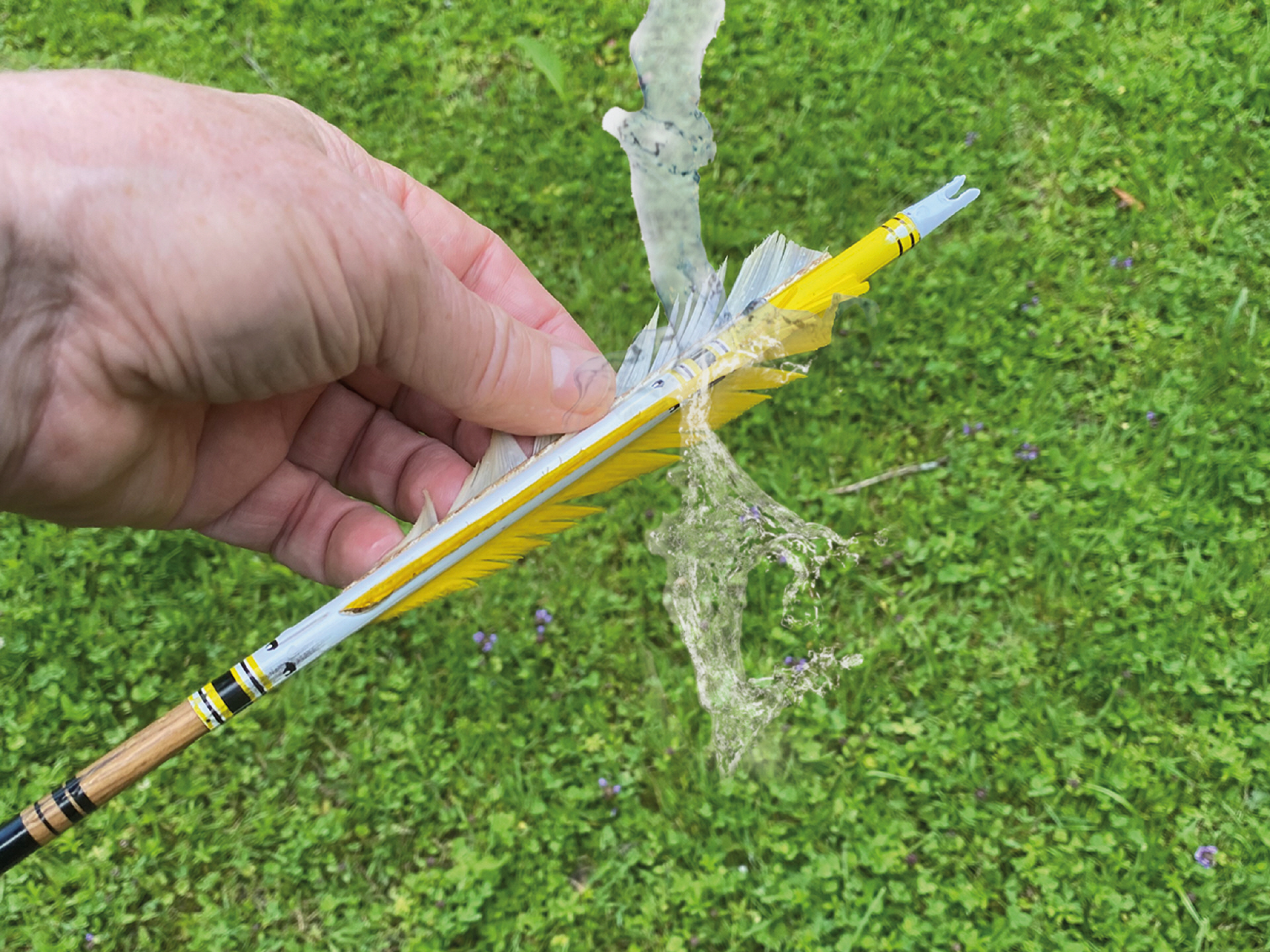 Naturfedern haben Vorteile, aber auch so ihre Nachteile. Zu den Vorteilen gehört zweifelsohne, dass sie sich extrem schnell nach dem Abschuss wieder aufstellen können. Ein Nachteil ist dagegen, dass sie im Lauf der Zeit Abnützungserscheinungen zeigen. Sie fransen beispielsweise aus oder verbiegen sich und können natürlich auch Teile verlieren. Und wenn sie nass werden, leidet die Flugeigenschaft des Pfeils sehr darunter.