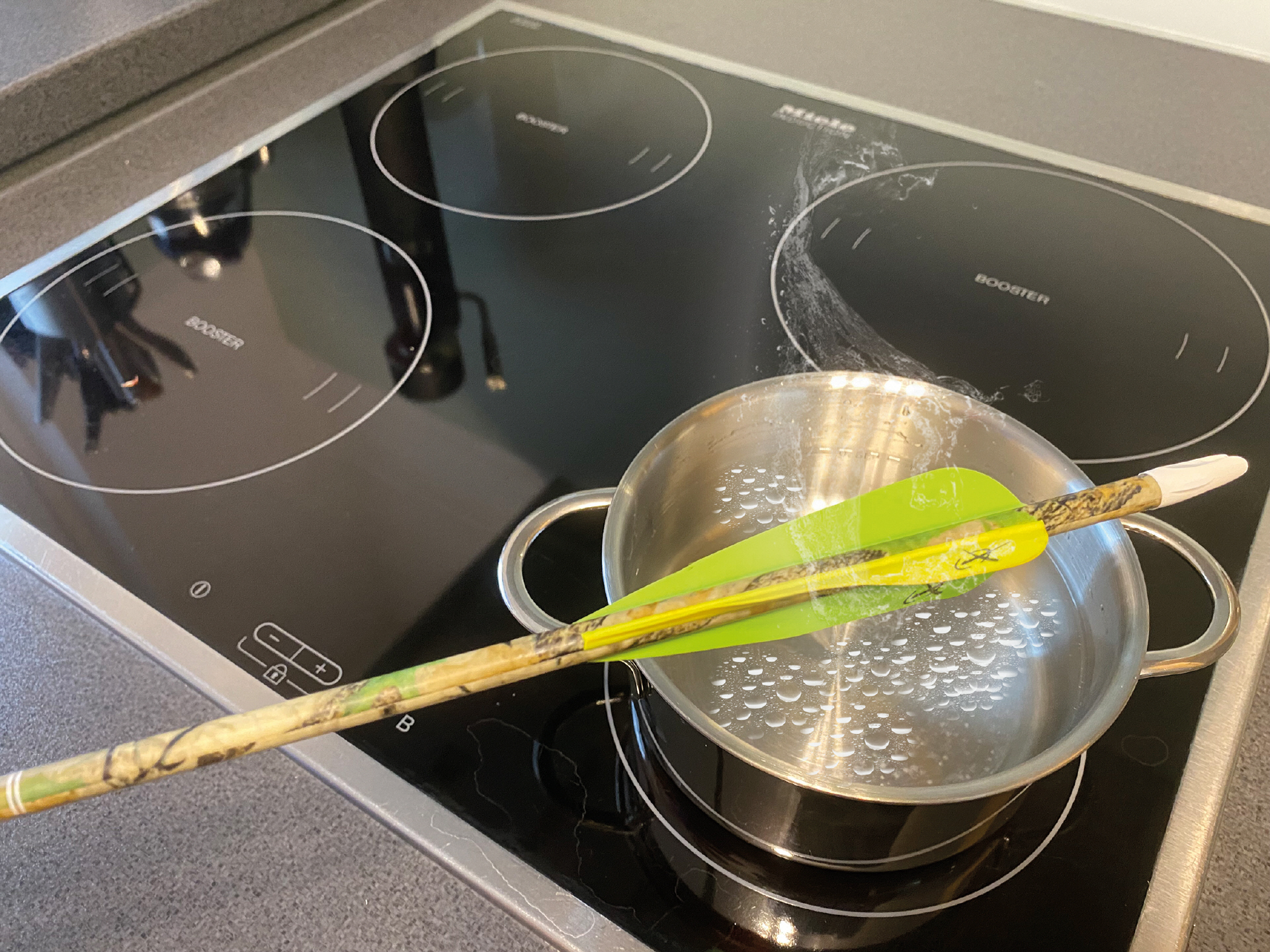 3) Wenn sich dadurch die Federnäste aufrichten, ist es gut. Wenn nicht, verfährt man wie im oben gezeigten Beispiel. Man hält die Pfeile in den Wasserdampf.