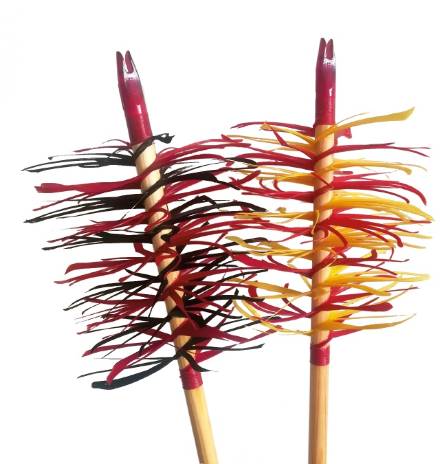 Bei Flu-Flu-Pfeilen, oder auch nur Flu-Flus genannt, handelt es sich um Pfeile, die speziell für kurze Distanzen geeignet sind. Ursprünglich wurden sie für die Vogeljagd entwickelt, werden aber auch heute noch dazu in Ländern, wo die Bogenjagd erlaubt ist, verwendet. Würde man mit einem normalen Pfeil auf einen fliegenden oder auf einem Baum sitzenden Vogel schießen und nicht treffen – was hin und wieder vorkommen soll – würde der Pfeil im Nirwana verschwinden. Einen Flu-Flu hingegen findet man sehr schnell wieder. Er steckt dann nämlich in relativ kurzer Entfernung senkrecht in der Erde. Die Art der Befiederung bremst den Pfeil nämlich so stark ab, dass er nach rund 30 Metern senkrecht zu Boden fällt.