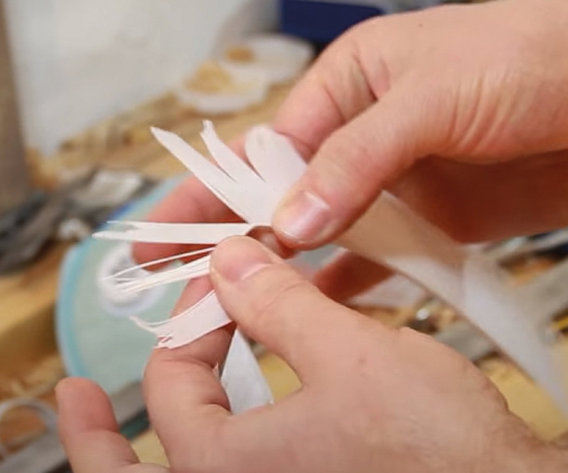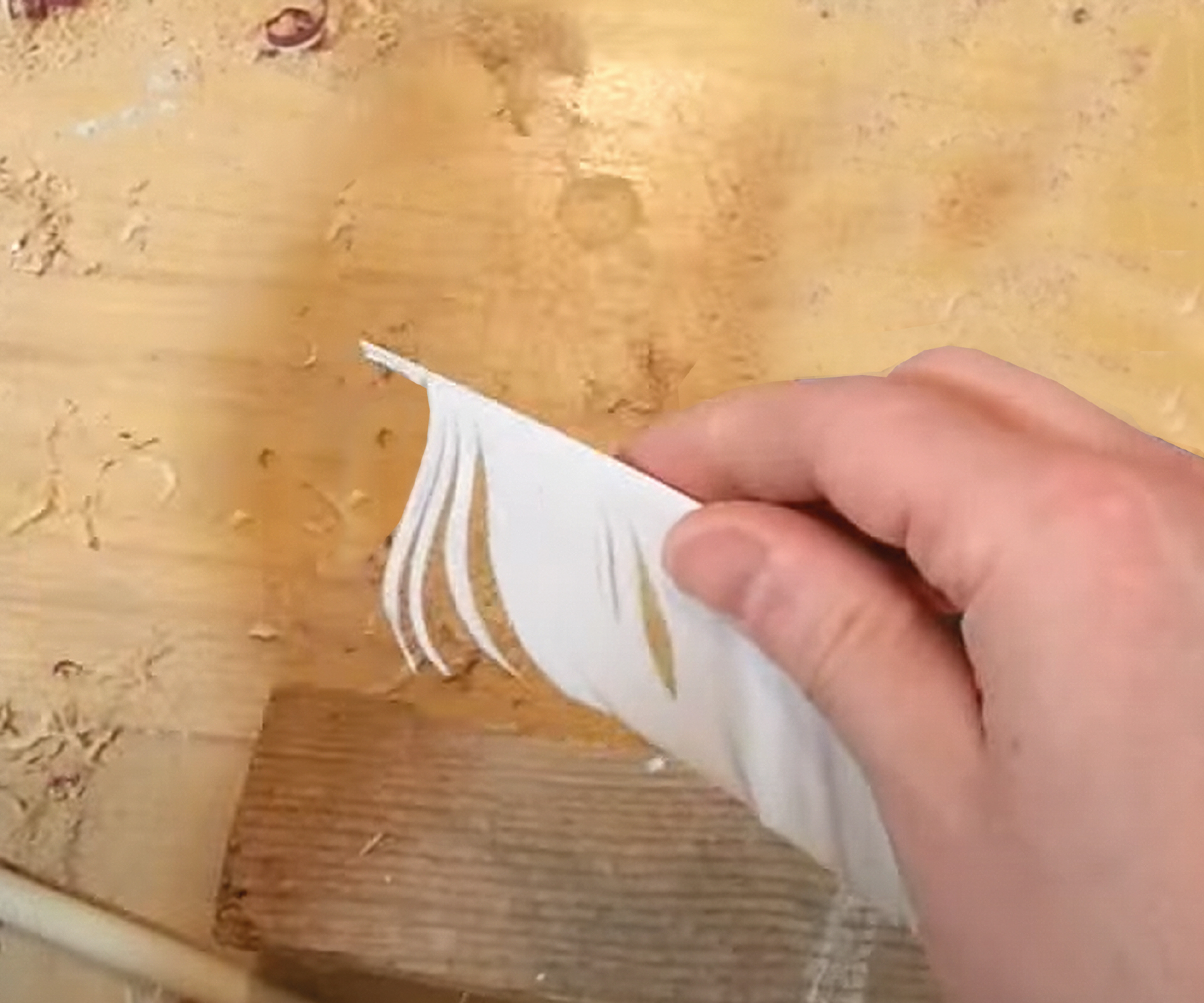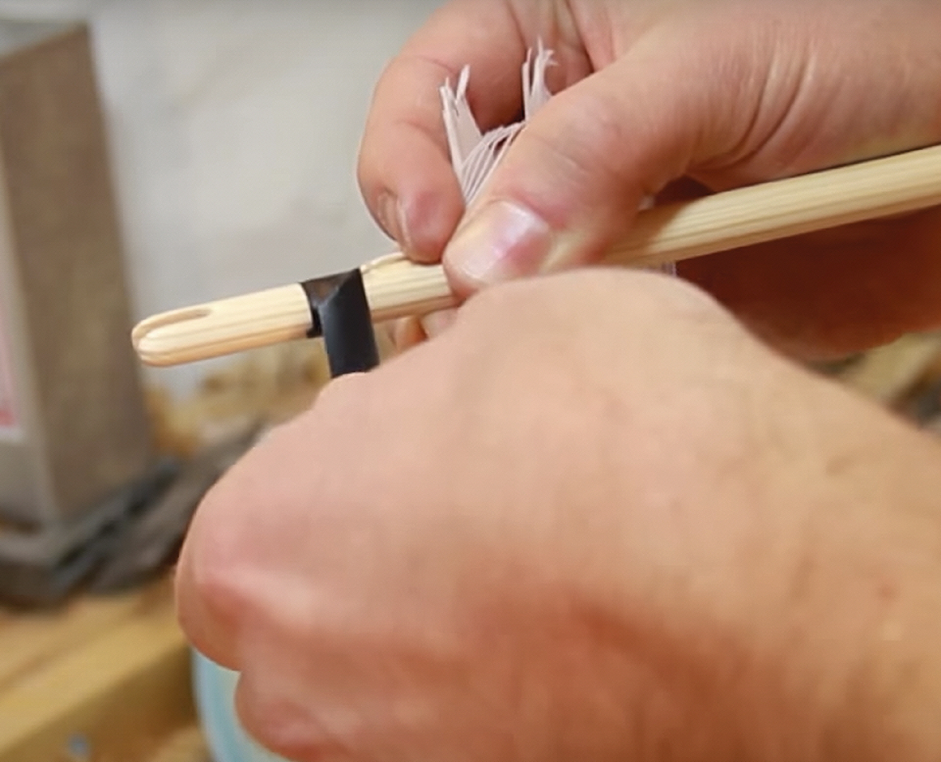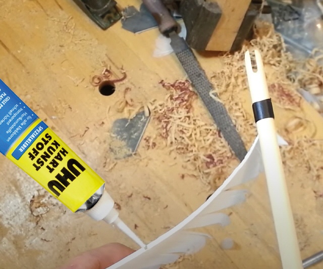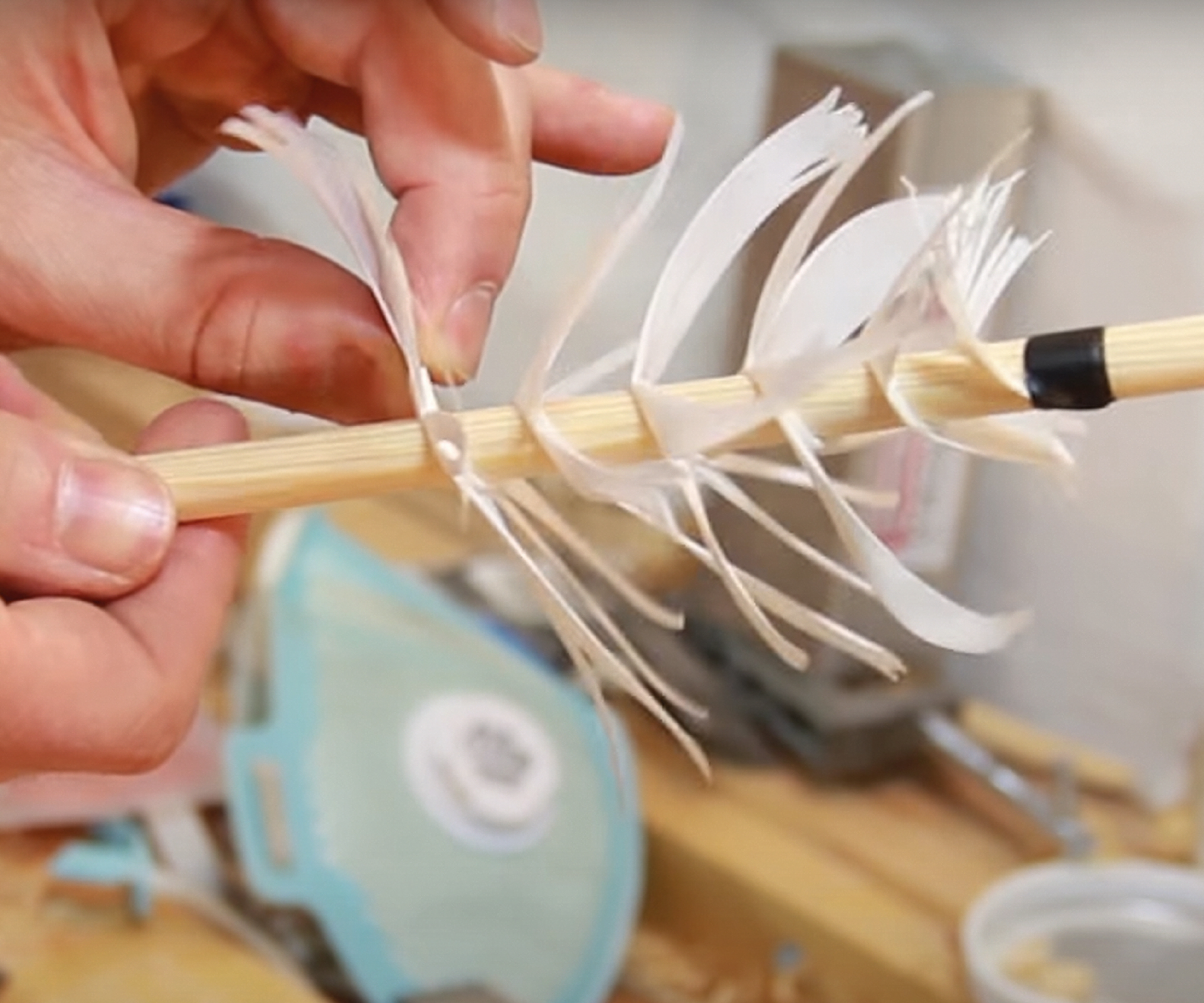 Genau wie die sechs Federn werden 4 bis 5,5 Zoll lange, unbeschnittene Federn im Abstand von 90 Grad an den Schaft geklebt. Diese Art erzeugt nicht so viel Luftwiderstand wie die anderen beiden vorher genannten Varianten und sollte nur mit leichten bis mittelschweren Bögen verwendet werden.