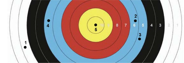 Wenn jemand damit zu kämpfen hat, dass der Pfeil das eine Mal zu weit links trifft, das andere Mal zu weit rechts, dann ist guter Rat teuer. Oft ist es aber einfach so, dass der Schütze noch zu wenig Übung hat. Dann macht man nämlich alle möglichen Fehler und diese führen dann zu einem solchen Trefferbild.