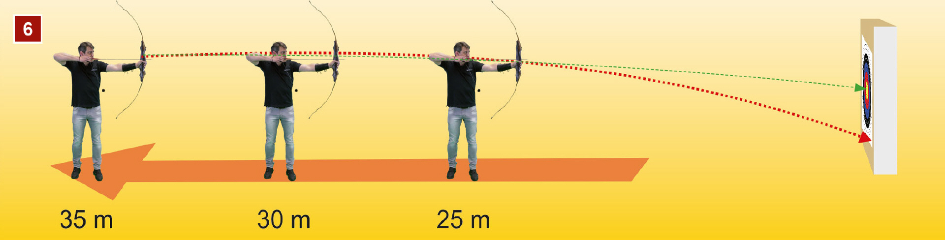 Oft passiert es, dass man zu wenig zieht. Dadurch hat der Pfeil eine geringere Geschwindigkeit und trifft dadurch logischerweise tiefer. Je weiter die Schussentfernung ist, desto größer ist die Abweichung.