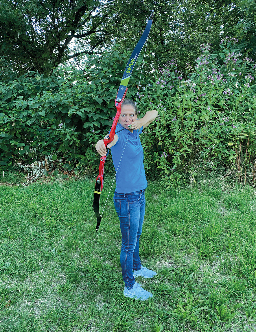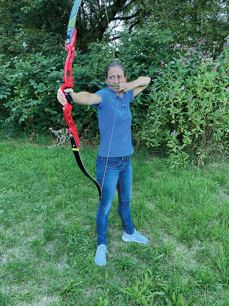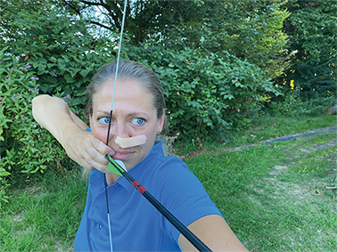 Eine Alternative wäre auch, dass man den Bogen leicht umlegt. Auch wenn das bei einem Recurveschützen prinzipiell nicht notwendig ist, sollte man das versuchen. Wie weit man umlegen sollte, hängt von der Nase ab. Auch hier kann ein Kollege helfen. Allerdings muss man dann üben, immer die gleiche Neigung zu erwischen.