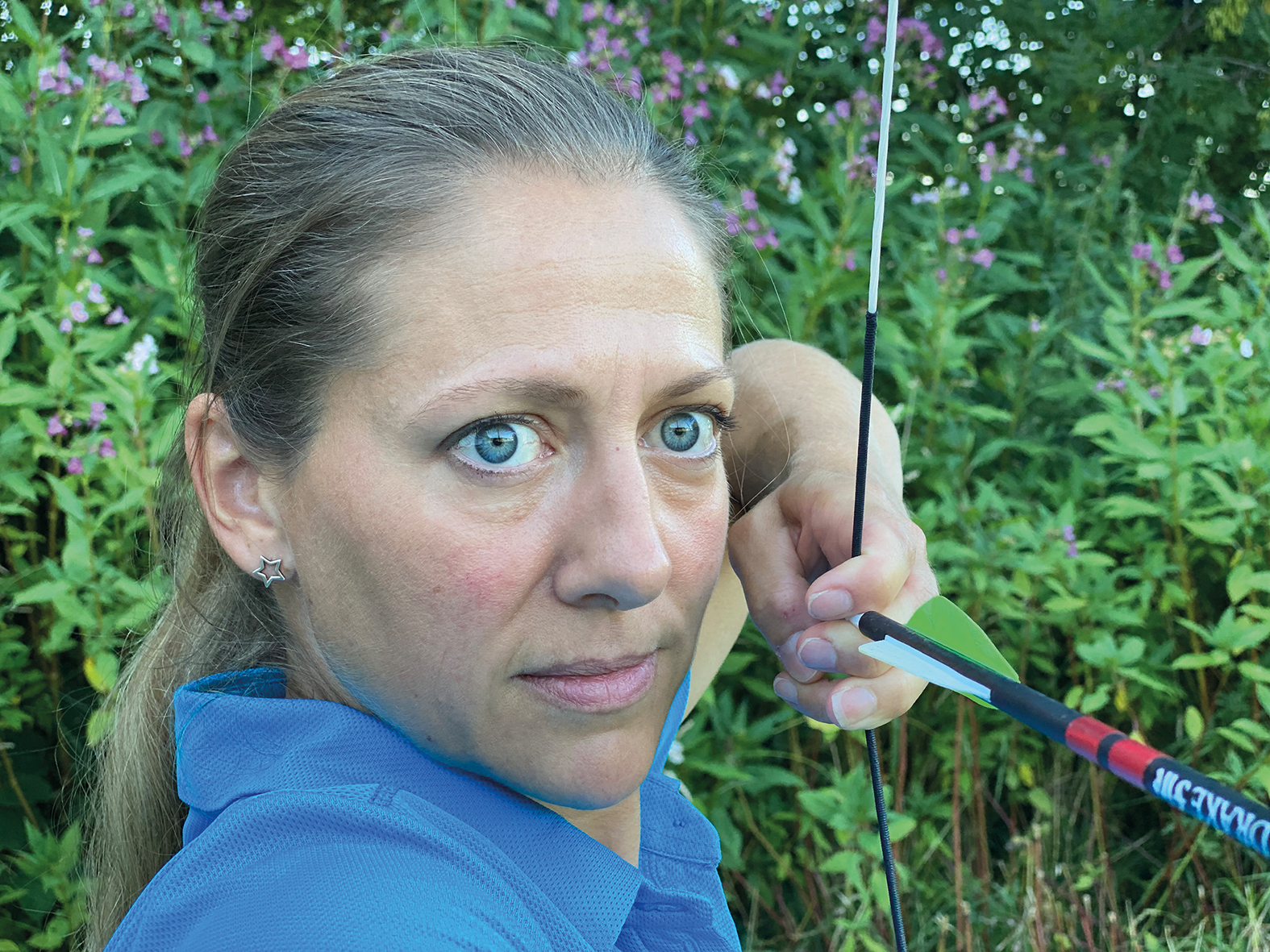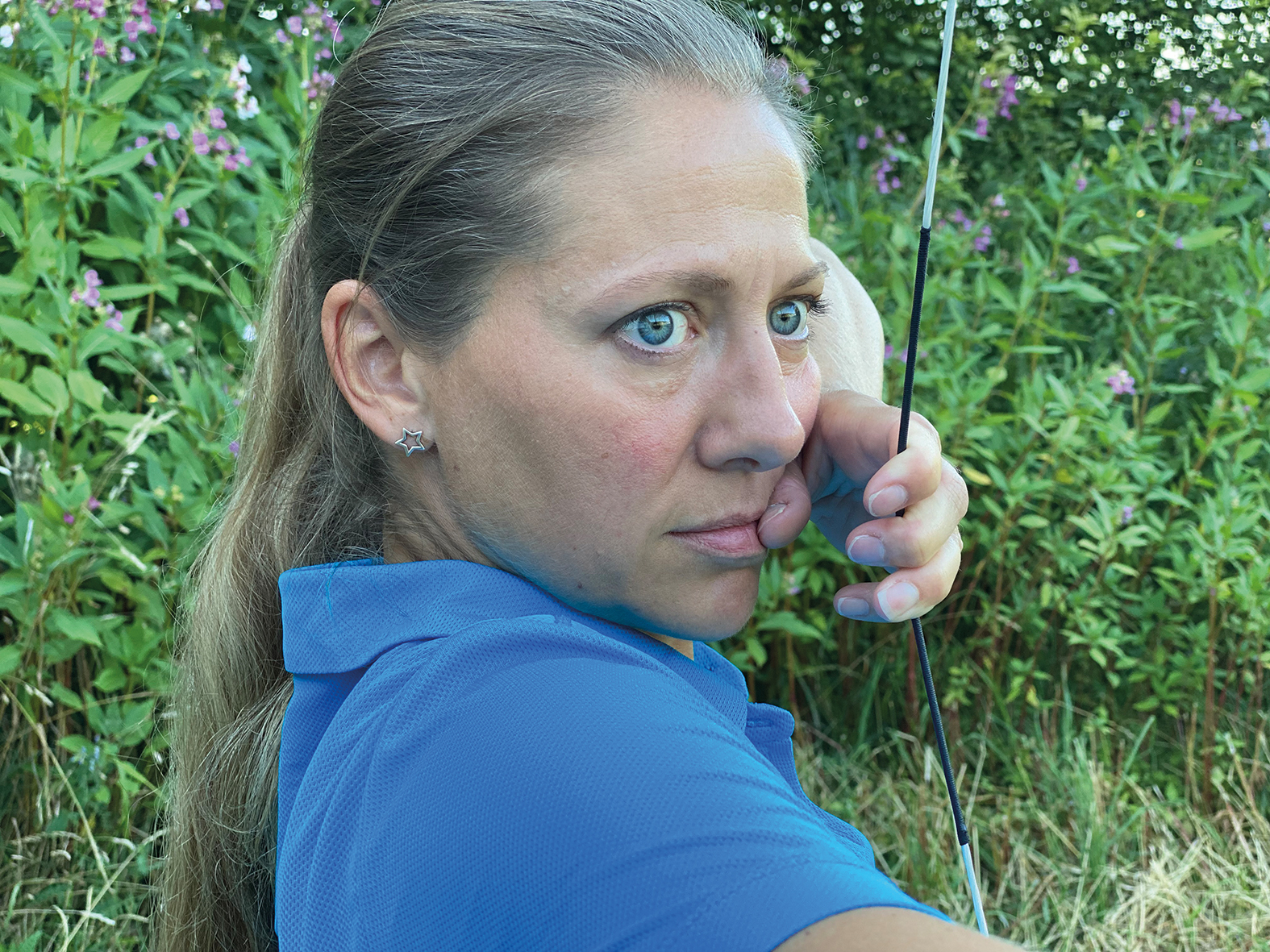 Dazu versucht man offen zu stehen. Dadurch vergrößert sich das Dreieck Pfeilauflage - Bogenschulter - Ankerpunkt. Wichtig ist dabei aber, dass man so ankert, dass die Sehne vor dem Auge ist.