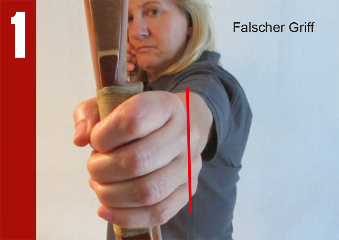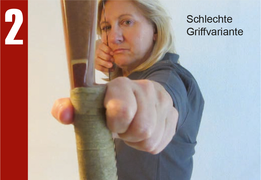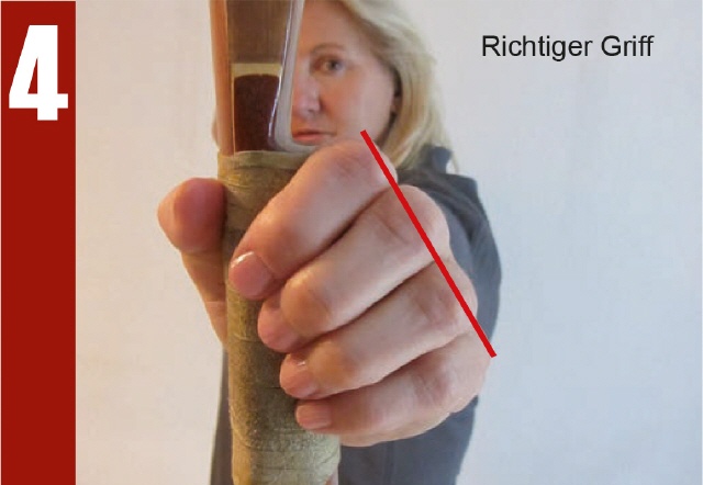 Die richtige Haltung der Bogenhand erkennt man daran, dass die Knöchel in einem Winkel von rund 45° schräg nach unten zeigen. Auch sollte man von vorne betrachtet die Fingernägel sehen können. Der Bogen wird dabei nicht fest gehalten. Es werden vielmehr die Finger nur leicht auf den Griff gelegt, um das Wegspringen nach dem Schuss zu verhindern (Bild 4). |
