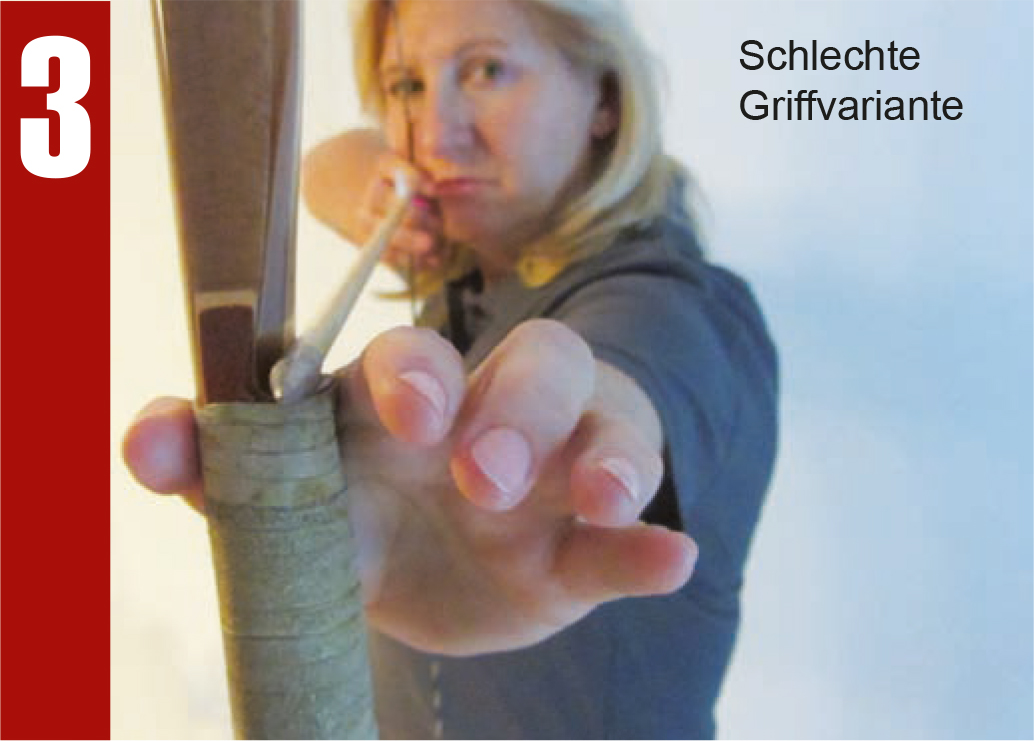 Punkt Nummer 2 ist der falsche Griff am Bogen. Wenn man den Bogen fest krallt, sodass die Fingernägel weiß werden, überträgt sich jede Bewegung des Bogenarms auf den Bogen. Das erkennt man auch daran, dass die Knöchel der Bogenhand senkrecht nach unten zeigen (Bild 1). Auch sind Griffvarianten, wo der Bogen nur zwischen Daumen und Zeigefinger aufgehängt ist, nicht zu empfehlen. Man hat hier keinen festen Druckpunkt und der Bogen kann sich hier sehr leicht bewegen (Bild 2 und 3). |