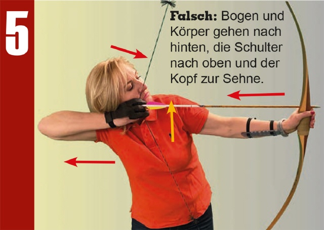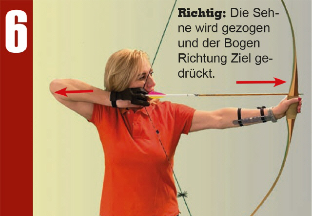 Ein weiterer Rat, um das Handzittern zu verhindern ist, dass man nicht nur zieht, sondern auch den Bogen aktiv Richtung Ziel drückt. Das sieht man zwar von außen nicht, man spürt es aber selbst, wenn man es tut. Vor allem bei ungeübten Schützen sieht man dann oft, dass beim Auszug der Bogen und der Körper nach hinten gehen. Auch versuchen sie dann mit dem Kopf zur Sehne zu gehen (Bild 5 und 6). |