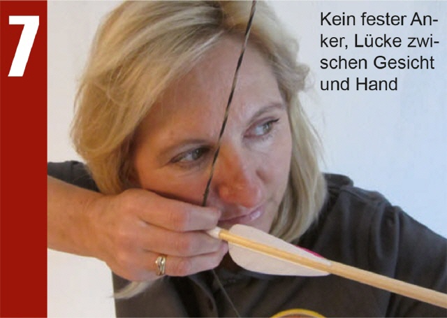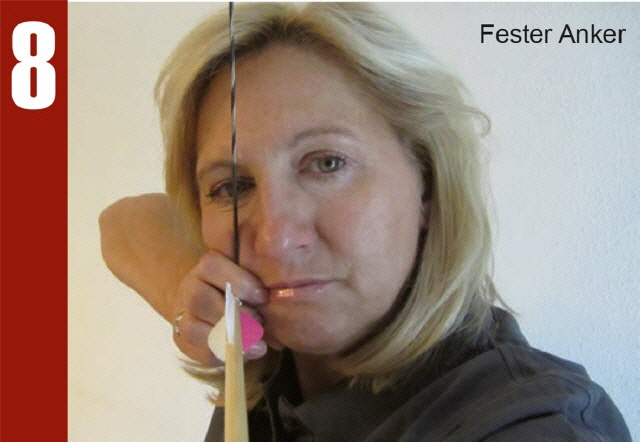 Ein weiterer Grund, warum die Bogenhand zittert, ist, dass der Anker nicht fest und stabil ist. Ankert man nämlich neben dem Gesicht, praktisch in der Luft, kann man eine gewisse Unruhe nicht verhindern. Man hält quasi den Bogen frei in der Luft und kann ihn damit nicht ruhig halten (Bild 7). Vielmehr sollte die Hand fest am Gesicht liegen. Damit ist der Anker fest und stabil und kann so auch den Bogen leichter Richtung Ziel drücken (Bild 8). |