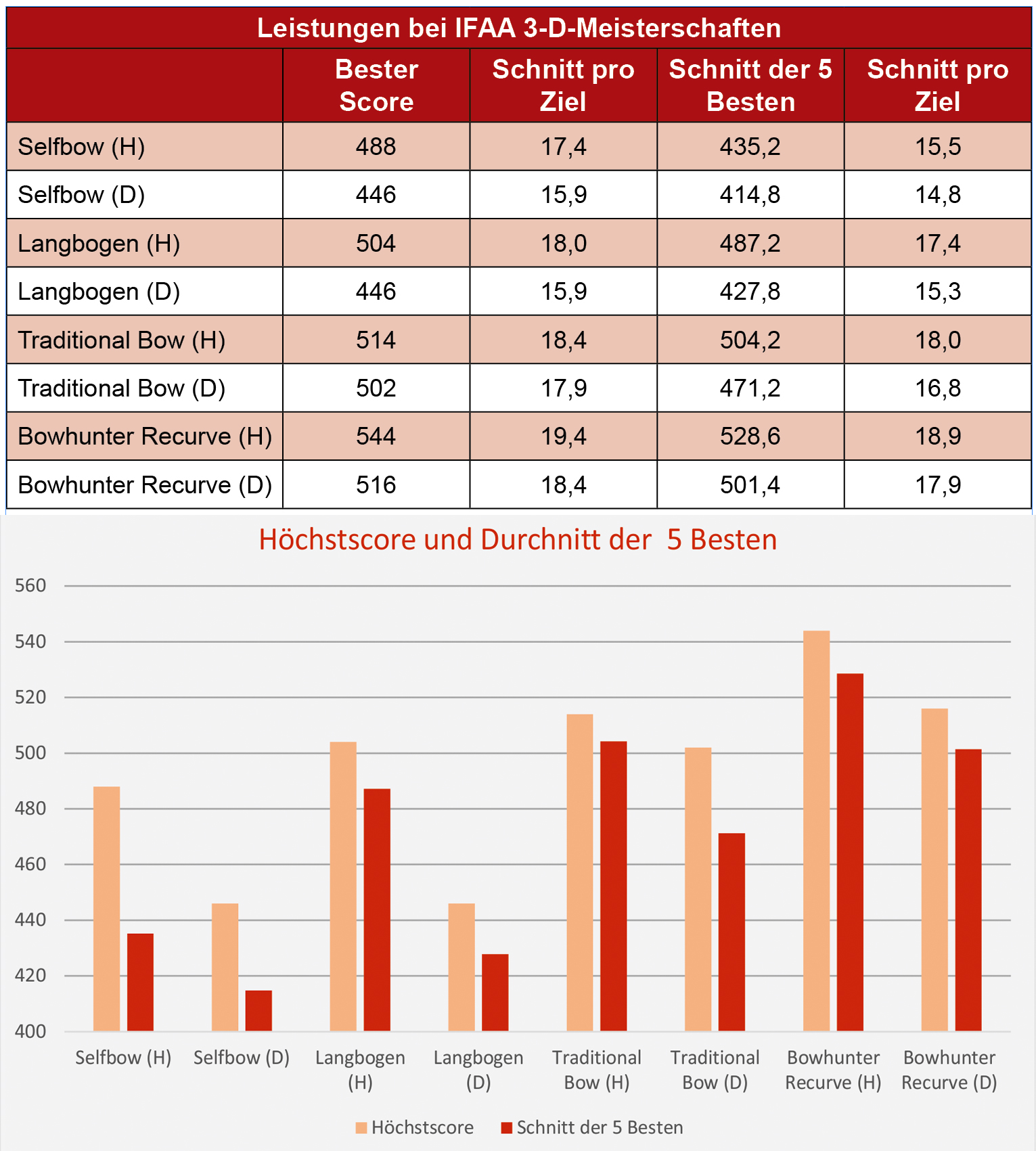 Etwas schwieriger ist es schon, den Vergleich mit 3-D-Schützen zu machen. Nimmt man die Ergebnisse z.B. der WBHC (World Bowhunter Championships) oder EBHC (European Bowhunter Championships) der IFAA kommt man der Sache schon etwas näher.