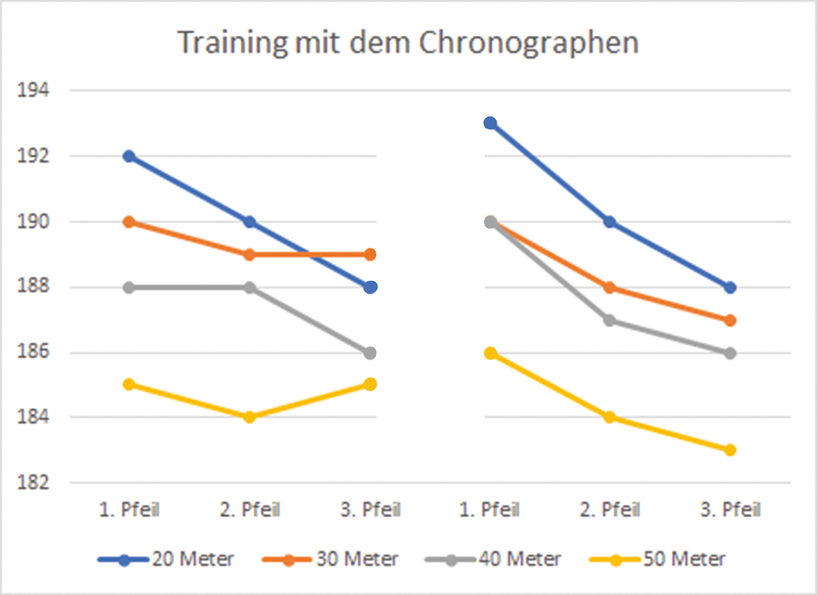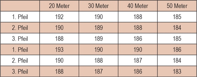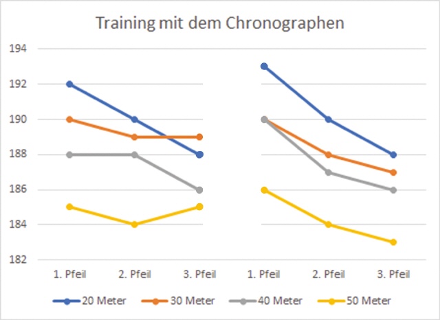Geschossen wird dabei auf unterschiedliche Entfernungen: 20, 30, 40 und 50 Meter. Wenn man die Ergebnisse in ein Excel-Sheet einträgt und davon eine Grafik erzeugen lässt, kann man seine Schlüsse daraus ziehen. Nachfolgendes Beispiel mit zweimal drei Pfeilen pro Entfernung soll das verdeutlichen.