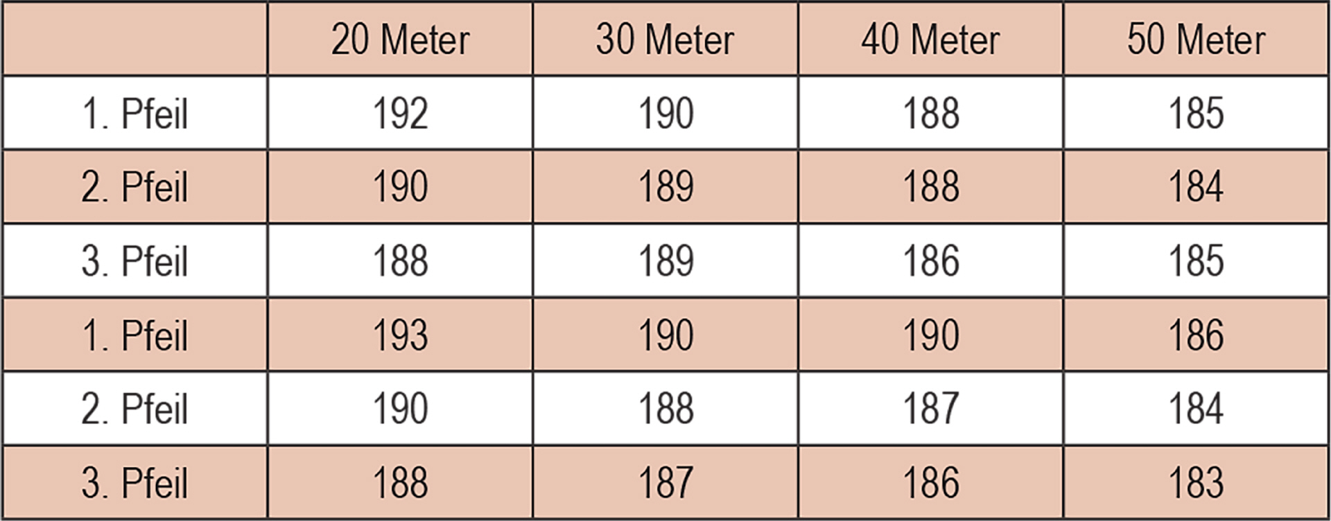 Der einzige stabile Faktor in dieser Aufzählung ist das Pfeilgewicht. Alle anderen Faktoren werden vom Schützen beeinflusst. Ziehe ich nicht richtig aus, ändert sich die Bogenstärke. Schieße ich nicht immer aus der Rückenspannung, hat es denselben Effekt. Und unsauberes Lösen ist für eine gleichbleibende Geschwindigkeit auch abträglich.