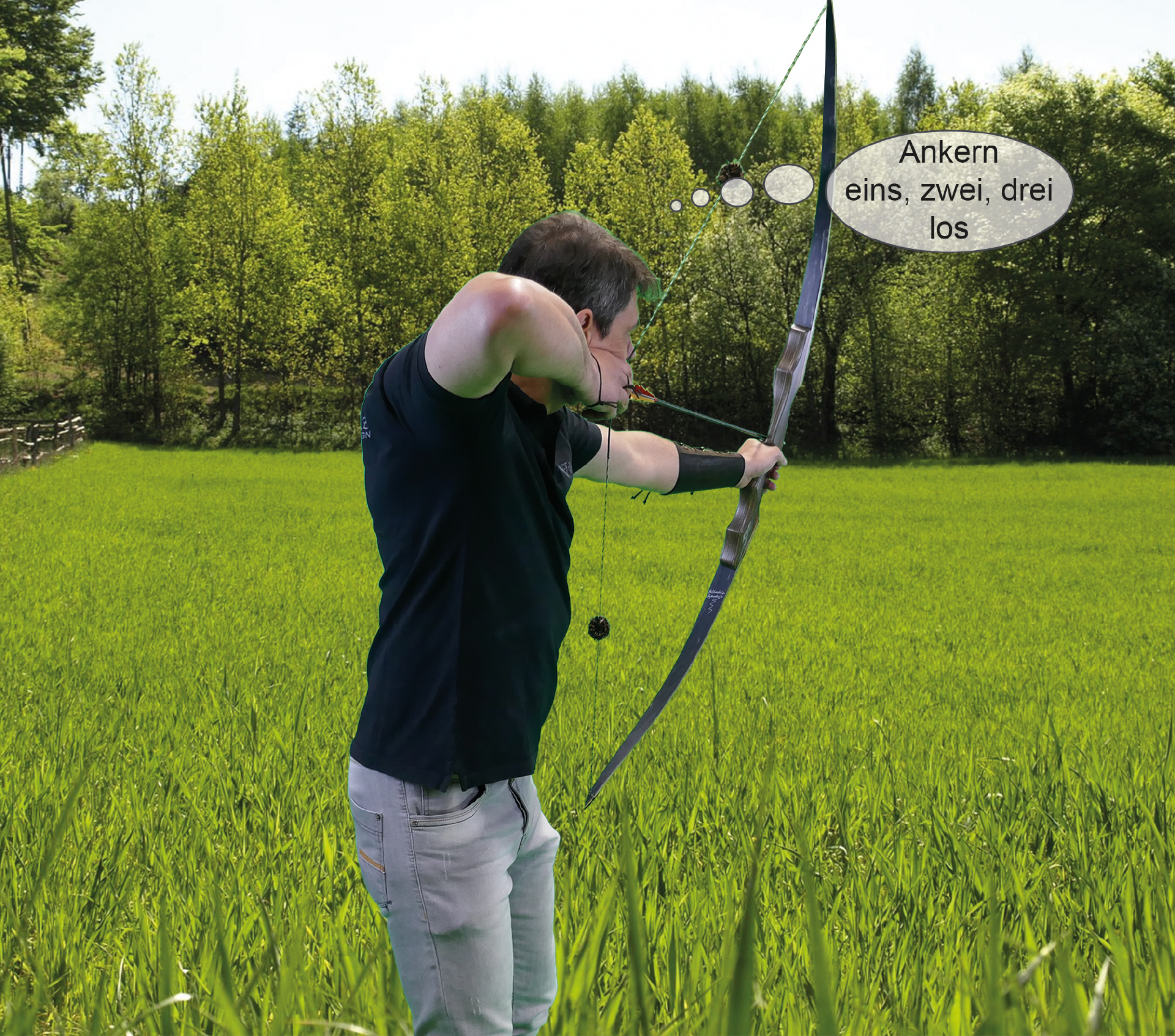 Eine sehr einfache Variante ist, dass man vor jedem Schuss einmal aufzieht, zwei bis drei Sekunden im Anker bleibt und dabei die Rückenspannung aufbaut und wieder absetzt. Eine andere sehr einfache Variante ist, dass man aufzieht, in die Rückenspannung geht und bewusst mit der Pfeilspitze einen Achter im Ziel macht und wieder absetzt. Erst dann zieht man wieder auf und schießt. Das kann man zum einen im Training konsequent machen. Diese Technik bietet sich aber auch am Parcours oder bei einem Turnier an. Wichtig ist, dass man das durchzieht.